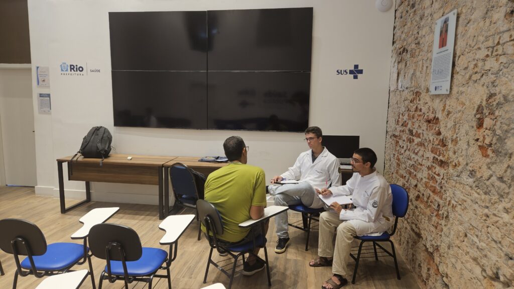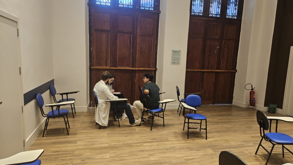 A atividade foi conduzida pelo professor Alexandre Telles. Durante o encontro, os alunos participaram de entrevistas clínicas com pacientes das Clínicas da Família, sendo divididos em grupos para garantir maior privacidade aos usuários. Ao longo da atividade, exercitaram habilidades de comunicação, escuta qualificada e construção de vínculo, aproximando-se da realidade do cuidado em saúde.